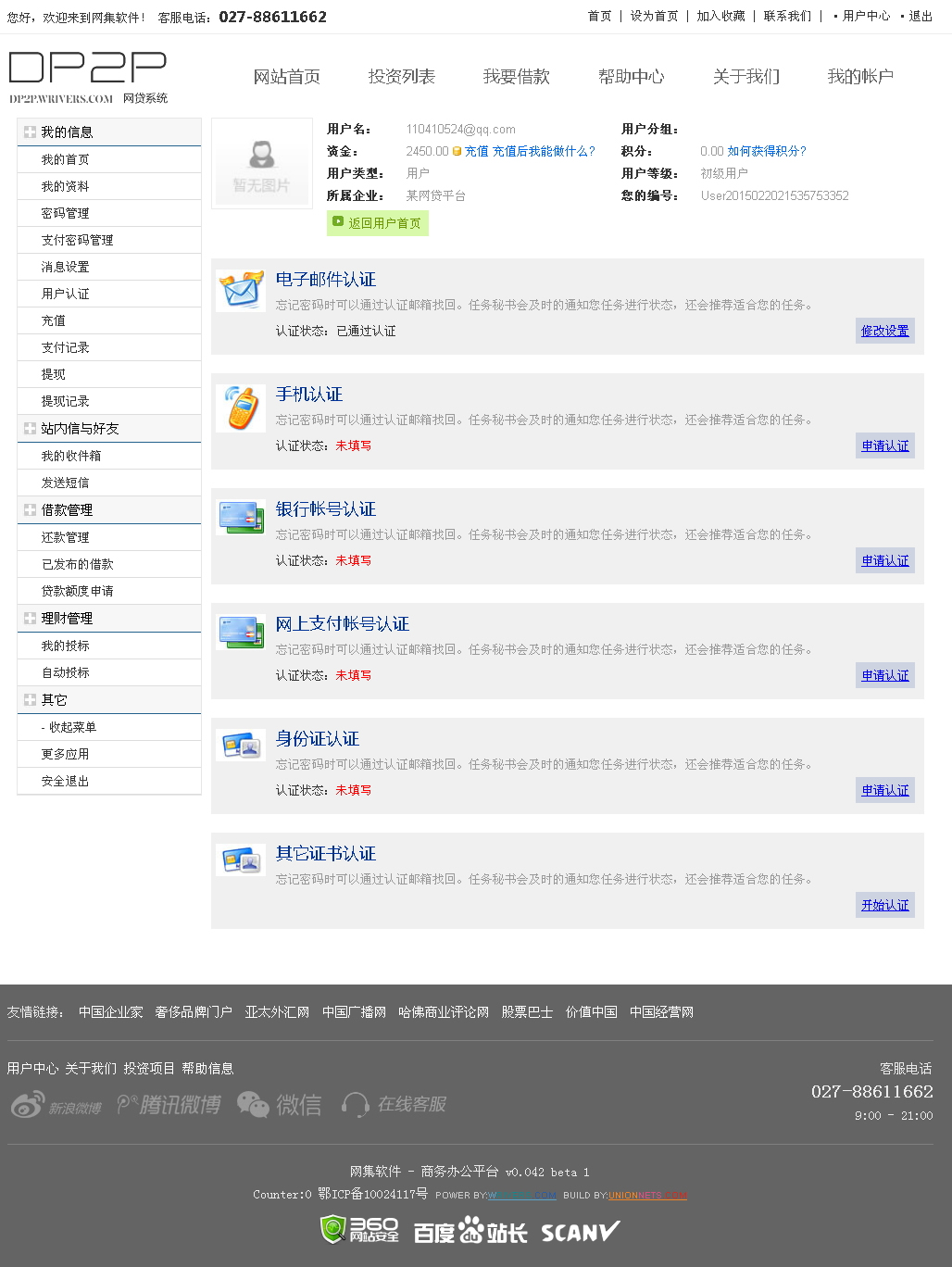 | 用户认证 | 用户电子邮件审核、手机审核、头像审核、银行审核、支付方式审核、身份证审核、信用审核、收入审核、购车审核、购房审核、期权审核、现场审核、个人信息审核、视频审核、联系人审核、居住审核、工作审核、结婚审核、学历审核、技术审核、抵押审核、机构担保审核、其它证书审核 |