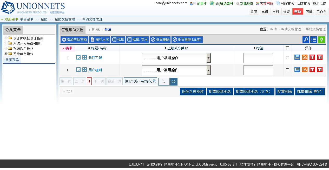 | 系统设置 | 系统的各项参数设置,如系统的TITLE、KEYWORD、系统名称、LOGO、系统数据配置、上传设置、邮件设置、用户相关参数设置等 |